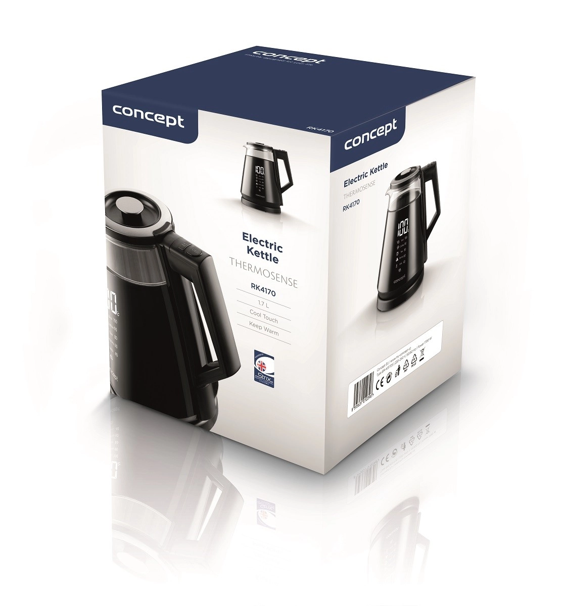 ThermoSense RK4170 je sodoben stekleni grelnik vode, ki izstopa z elegantnim dizajnom in berljivim digitalnim zaslonom. Ponuja prostornino 1,7 litra, možnost uravnavanja temperature v štirih korakih (40°C, 60°C, 80°C, 100°C) ter funkcijo ohranjanja temperature (KEEP WARM) do 4 ur.