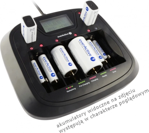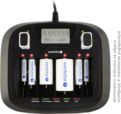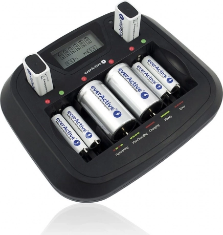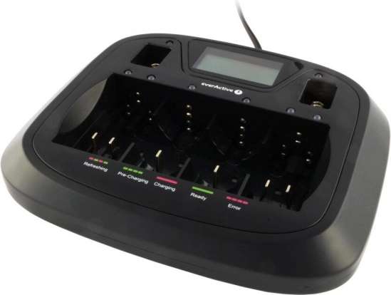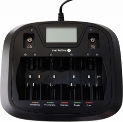 Iščete polnilec, ki se spopade z večino standardnih in večjih členov ter omogoča polnjenje tudi lihega števila baterij? Univerzalni procesorski polnilec EVERACTIVE ponuja 8 popolnoma neodvisnih kanalov z inteligentnim upravljanjem. Z obnovitvijo (refresh) in praznjenjem lahko izboljša kondicijo vaših Ni‑MH akumulatorjev in podaljša njihovo življenjsko dobo.