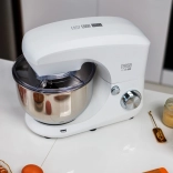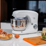 Velika nerjaveča posoda s prostornino 5,5 litra je idealna za večje količine testa ali krem. Priložen je tudi zaščitni pokrov, ki pomaga ohranjati kuhinjo čisto med mešanjem. V kompletu so kljuka za testo, ploski mešalnik in žičnata metlica – vsak nastavek je zasnovan za popoln rezultat določene naloge.