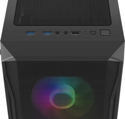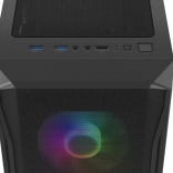 Zgornji I/O panel ponuja vse ključno: 2× USB 3.0, 1× USB 2.0, HD Audio 3,5 mm za slušalke in mikrofon, gumba Power/Reset ter indikacijske LED. Kaljeno steklo na levi bočnici poudari vaše komponente in RGB učinke, medtem ko gosti prašni filtri dolgoročno ohranjajo notranjost čisto.