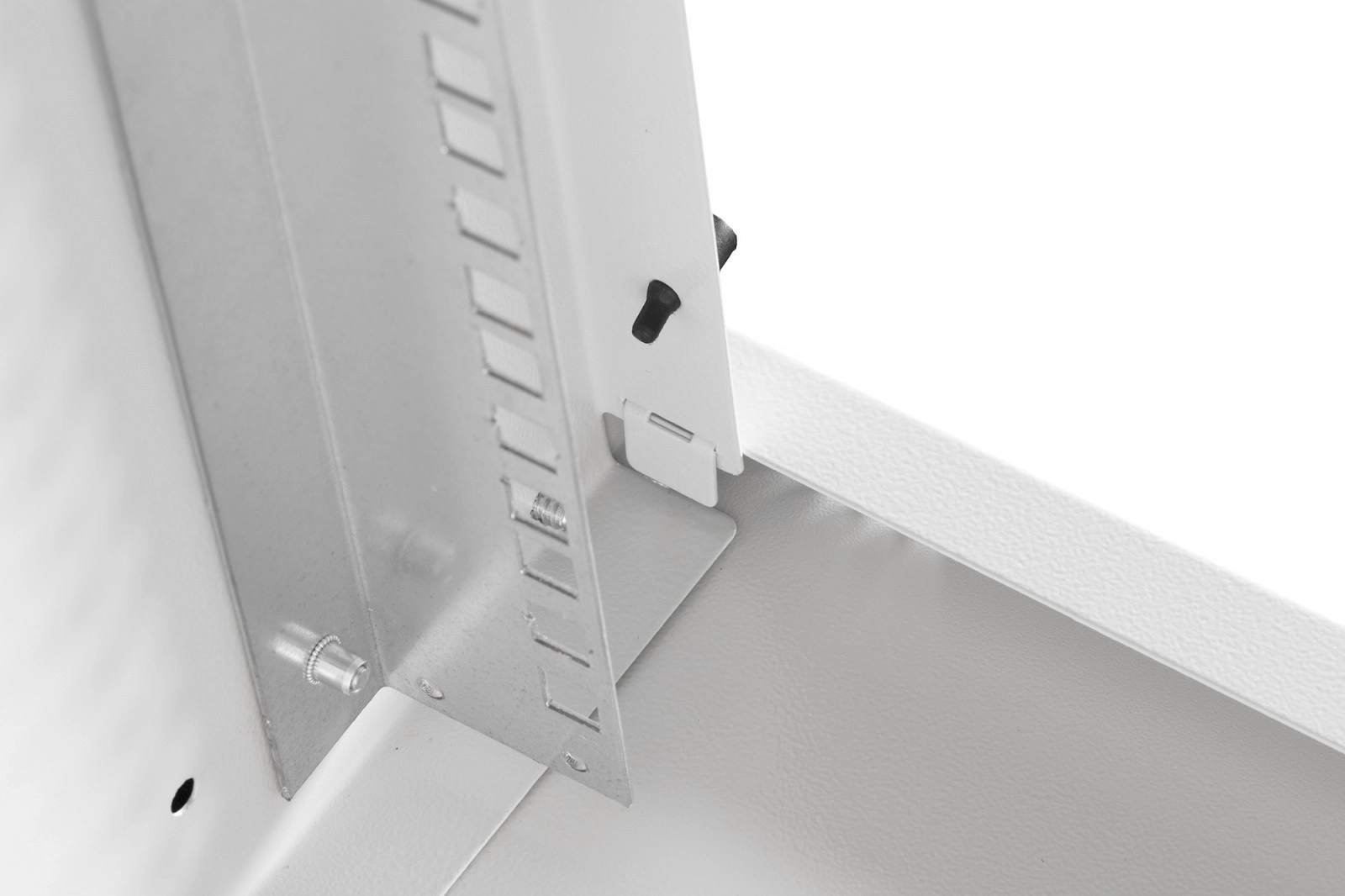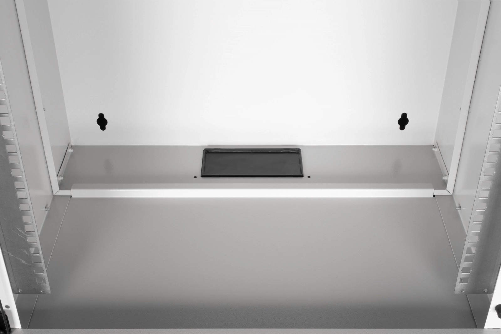 Omara je dobavljena nerazstavljena v ploščati embalaži za prihranek prostora in stroškov prevoza. Zahvaljujoč jasnim navodilom je namestitev hitra in jo lahko izvedete v nekaj korakih. Sprednji 19" profili (483 mm) so pocinkani, njihovo globino pa je mogoče brezstopenjsko nastaviti za natančno namestitev opreme. Zgornji prehod s ščetkasto letvijo in spodnji plastični prehod olajšata čisto vodenje kablov, medtem ko prezračevalna perforacija podpira aktivno in pasivno hlajenje.
