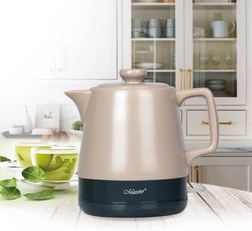 Elegantni keramični grelnik vode MAESTRO s prostornino 1 l in močjo 1200 W prinaša prefinjen dizajn in preprosto čiščenje. Keramično ohišje dobro zadržuje toploto in zmanjšuje nabiranje vodnega kamna, 360° vrtljiva baza olajša rokovanje, osvetljeno stikalo in samodejni izklop pa povečujeta varnost. Na voljo so tudi notranji indikator MAX, skrit grelni element in predal za kabel.