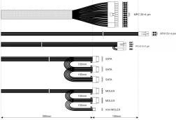 Bogata oprema konektorjev omogoča preprosto priklopitev sodobnih in starejših diskov ter grafičnih kartic: PCI‑E 6+2 pin za GPU, 3× SATA za SSD/HDD, 2× MOLEX in mini‑MOLEX za dodatno opremo, P4 4‑pin za CPU ter univerzalni 24‑pin konektor za osnovne plošče.
