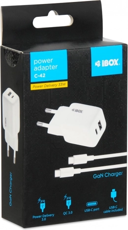 Polnilec iBox C-42 je zasnovan za najnovejše standarde polnjenja, vključno s Power Delivery 3.0 in Quick Charge 3.0. Zahvaljujoč tehnologiji GaN je bolj kompakten in učinkovitejši od tradicionalnih polnilcev, kar zagotavlja, da se naprave med polnjenjem ne pregrevajo.