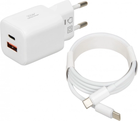 Z dvema priključkoma, USB-C in USB-A, omogoča hitro in varno polnjenje več naprav hkrati. Priložen kabel USB-C na USB-C olajša povezovanje.