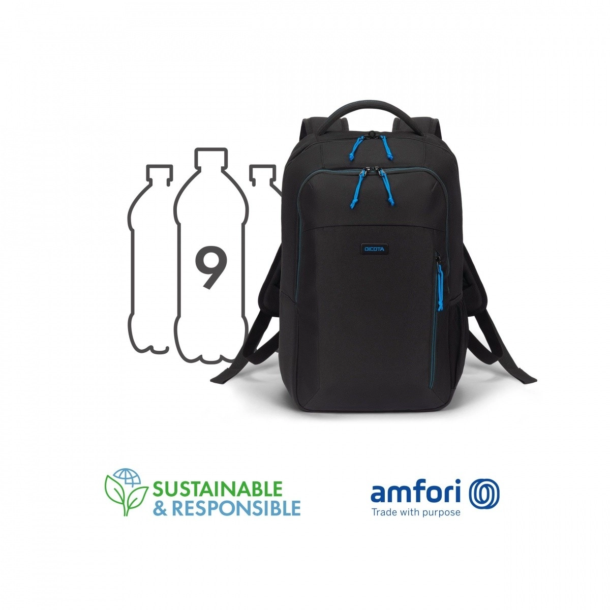 Nahrbtnik je izdelan iz recikliranega PET (9 steklenic), je odporen na vsakodnevno uporabo, dopolnjujejo pa ga kakovostne zadrge, kovinski logotip in diskretni modri detajli.