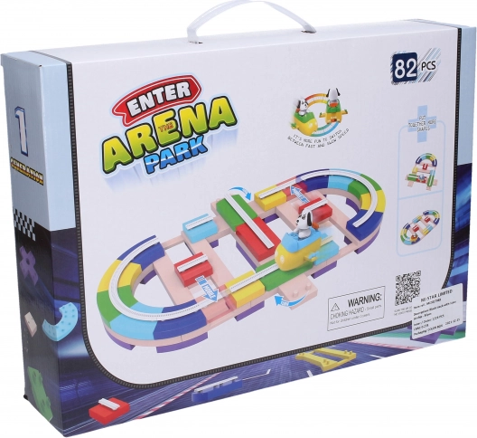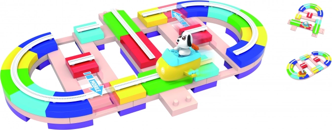 Zabavna dirkalna proga za otroke ponuja 118 cm dolgo progo, 82 gradbenih delov in premične elemente, s katerimi si mali vozniki zagotovijo ure kreativne zabave. Del kompleta je voziček z 2 hitrostnima načinoma, figurica psička ter priseski za boljšo stabilnost. Z ročnim prestavljanjem delov lahko med vožnjo spreminjate smer in obliko proge.