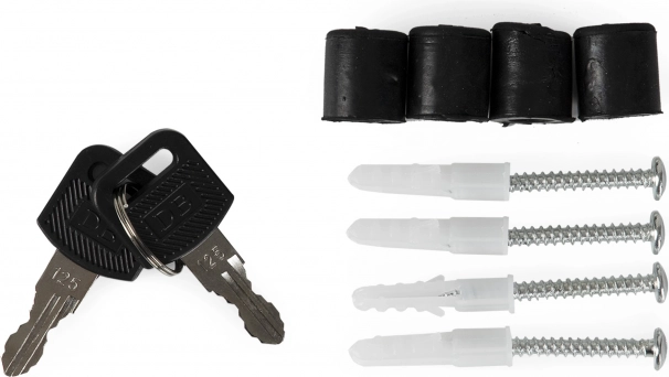 Paket vsebuje montažni set, vključno s štirimi zatiči in distančnimi podložkami, kar omogoča takojšnjo montažo po razpakiranju. Nabriralnik vsebuje dva ključa za povečano varnost.