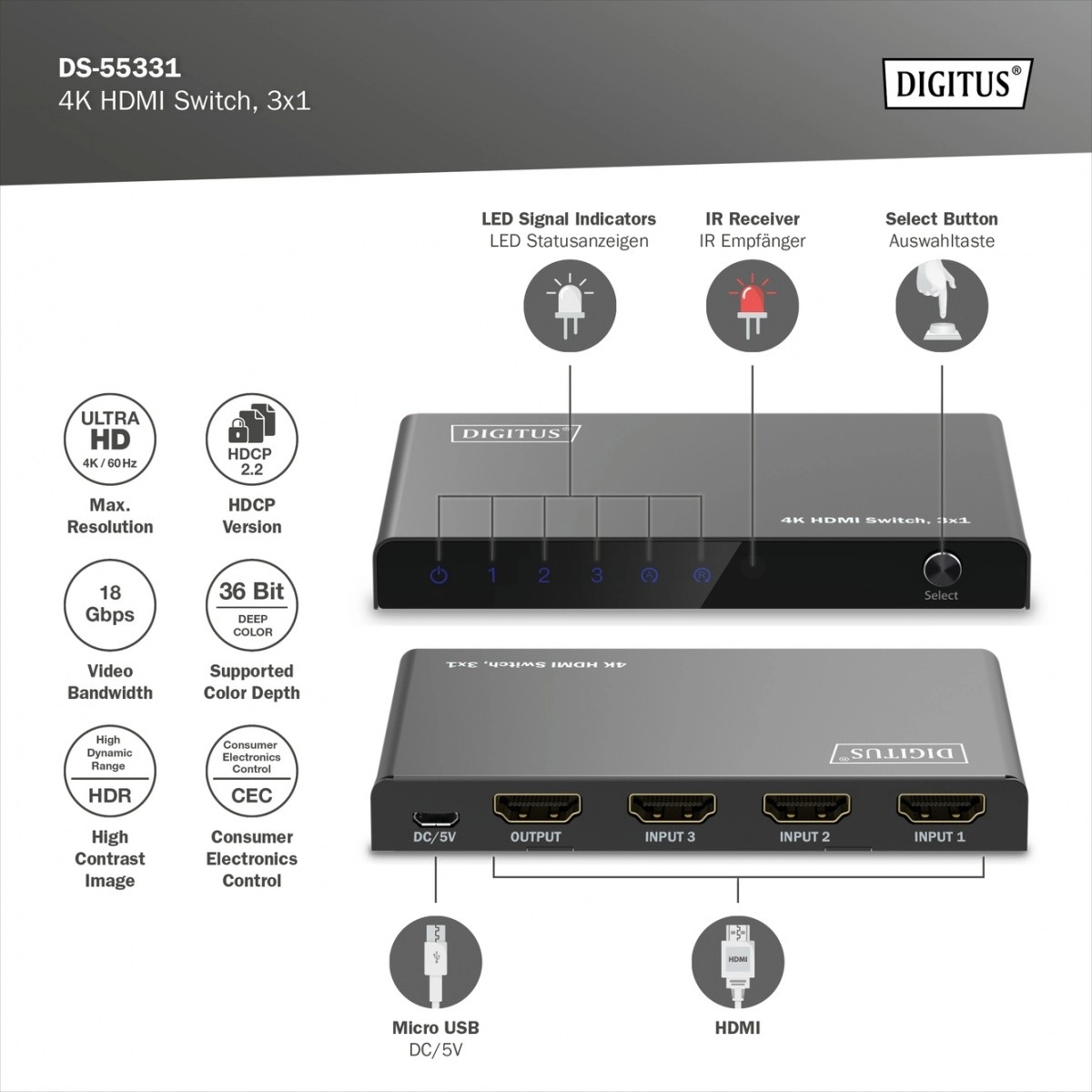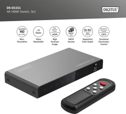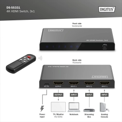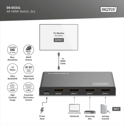 Končno brez nenehnega preklapljanja kablov. Kompaktni preklopnik DIGITUS 4K HDMI 3×1 elegantno razširi vaše naprave za tri polno funkcionalne HDMI vhode. Zahvaljujoč podpori za Ultra HD 4K pri 60 Hz in HDCP 2.3 boste uživali v ostri sliki in tekočem predvajanju z igralnih konzol, sprejemnikov, prenosnikov ali predvajalnikov.