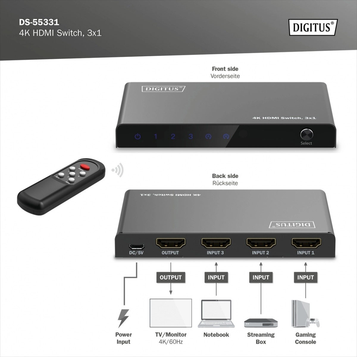 V kompletu je IR daljinski upravljalnik, na sprednji plošči pa tudi gumb za preklapljanje. Samodejno zaznavanje aktivnega vhoda še dodatno poenostavi uporabo.