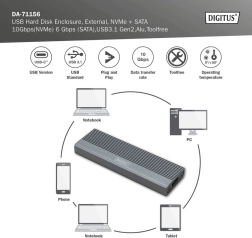 Univerzalno aluminijasto zunanje ohišje za SSD M.2 združuje hitrost 10 Gb/s za NVMe in 6 Gb/s za SATA, podpira formate 2230/2242/2260/2280 do 8 TB. Zahvaljujoč USB‑C 3.1 Gen 2, namestitvi brez orodja, pasivnemu hlajenju in LED-indikaciji je idealno za mobilno rabo v Windows, macOS, Linux in drugih platformah.