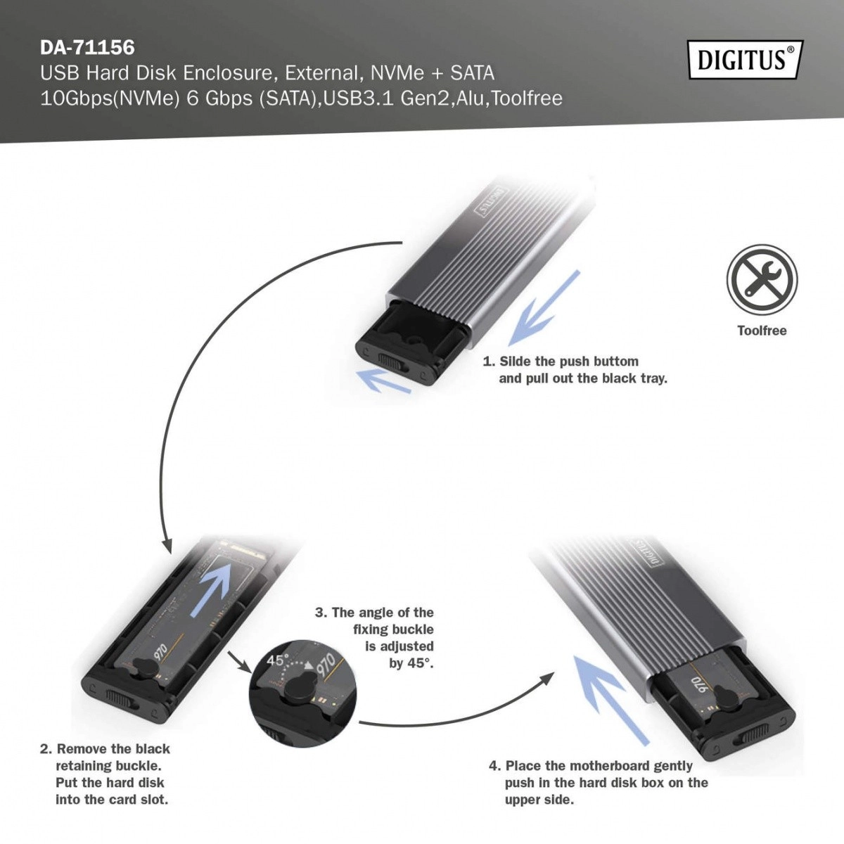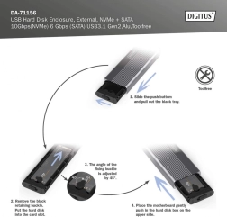 Razširite shrambo v hipu s kompaktnim in vzdržljivim aluminijastim ohišjem (Pantone 430C). Ponuja visoko hitrost prenosa do 10 Gb/s (NVMe) in 6 Gb/s (SATA), je popolnoma plug and play in se napaja neposredno prek USB. Konstrukcija brez orodja omogoča hitro menjavo diskov.