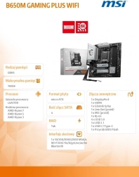 Igralna osnovna plošča MSI B650M Gaming Plus WiFi je zasnovana za procesorje AMD Ryzen serije 8000/7000, kar zagotavlja izjemno zmogljivost za namizne računalnike. Podpira DDR5 pomnilnik s frekvencami do 7200+(OC) MHz, kar omogoča hitro in učinkovito delo v sistemih, ki zahtevajo visoko pomnilniško prepustnost. Z izboljšano zasnovo napajalnega sistema 10+2+1 Duet Rail in dvojnima 8-pinskima priključkoma je pripravljena na zahtevne naloge.
