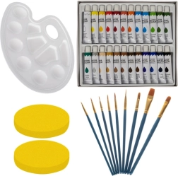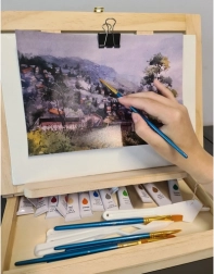Set vsebuje akvarelne barve, čopiče, platna in druge nujne pripomočke za začetek vaše umetniške poti.