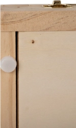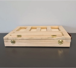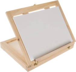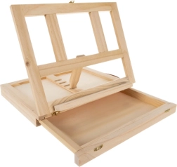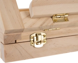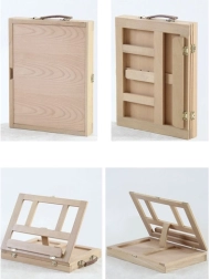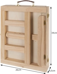 Leseni kovček je opremljen s predalom in stojalom, kar zagotavlja enostavno prenašanje in organizacijo umetniških potrebščin.