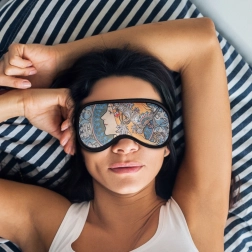 Uživajte v kakovostnem spanju in sprostitvi z elegantno masko za spanje, navdihnjeno z delom Alfonse Muche, motivom Zodiak (Zodiak). Prijeten material z dodatkom elastana se nežno prilagodi, je svilnato mehak na dotik in dobro prilega pri počitku, meditaciji in potovanju.