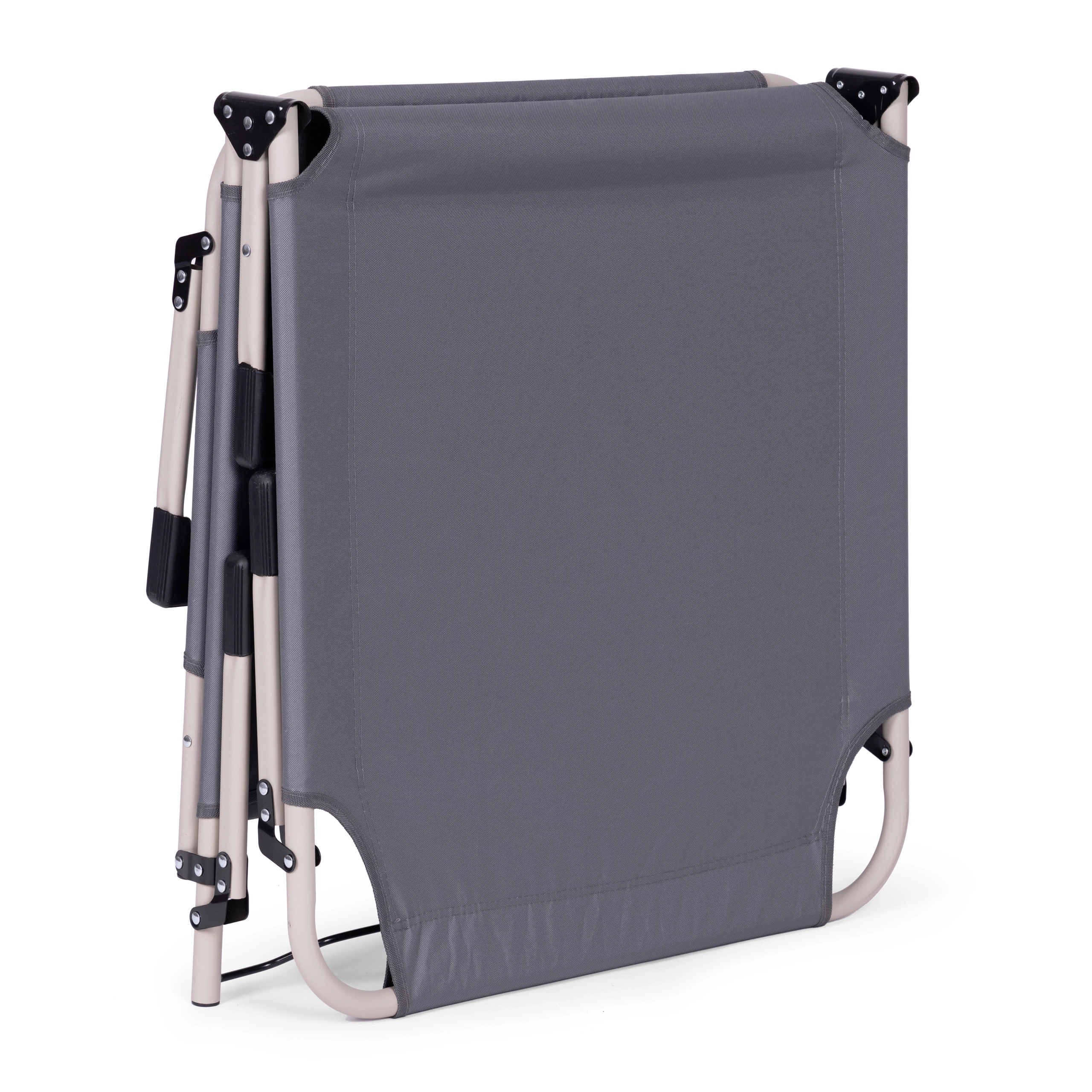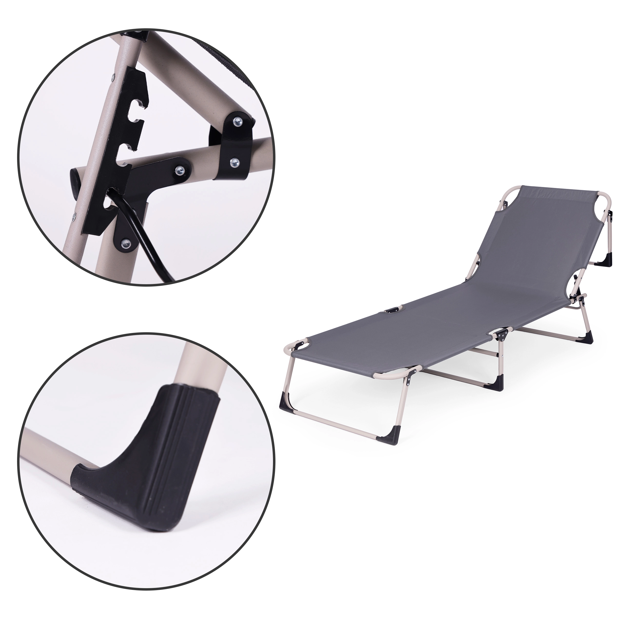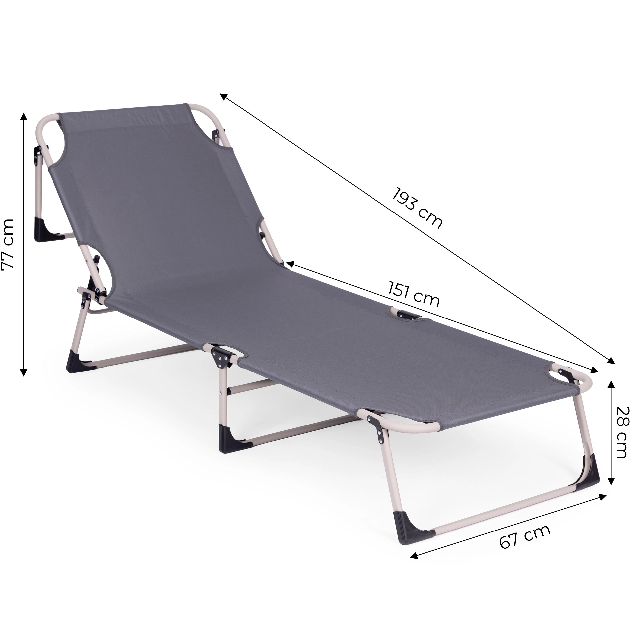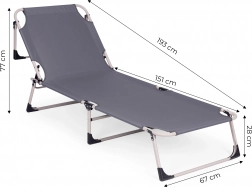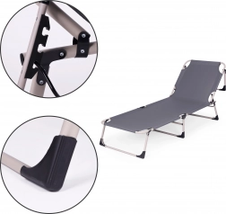 Lahkoten in udoben ležalnik je popolna izbira za vsako priložnost. Zaradi mehke futone, udobne blazine in nastavljivega naslona lahko uživate v udobju tudi med dolgimi urami ob vodi. Nedrseče podložke in kovinski okvir zagotavljajo stabilnost in varnost pri uporabi. Univerzalna siva barva zagotavlja stil in udobje.