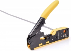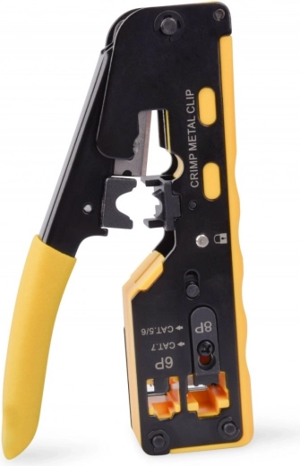 Robustna kovinska izdelava in udobni gumirani ročaji zagotavljajo zanesljiv oprijem tudi pri daljšem delu. Vgrajeni odstranjevalec izolacije in rezalnik skrajšata čas montaže – odvečni vodniki prehodnih konektorjev se ob krimpanju sočasno čisto odrežejo.