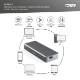 Široka podpora formatov M.2 (2230, 2242, 2260, 2280) in kapaciteta do 8 TB omogočata prilagodljivo razširitev shrambe. Robustni nabor čipov ASM2364 in masiven aluminij z rebrasto površino zagotavljata stabilnost, zanesljivost in učinkovito pasivno hlajenje. LED-indikator jasno prikazuje stanje diska.