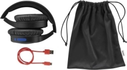 Sodoben črn dizajn dopolnjujejo modre ušesne blazinice, ki dodajo edinstven videz in skrbijo za udobje. Med dodatki sta rdeč USB polnilni kabel in črna prenosna vrečka, kar olajša uporabo na poti.