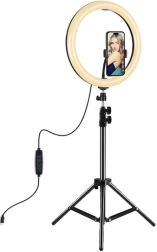 - LED krožna luč, stojalo, kroglična glava, nosilec za telefon, transportna torba