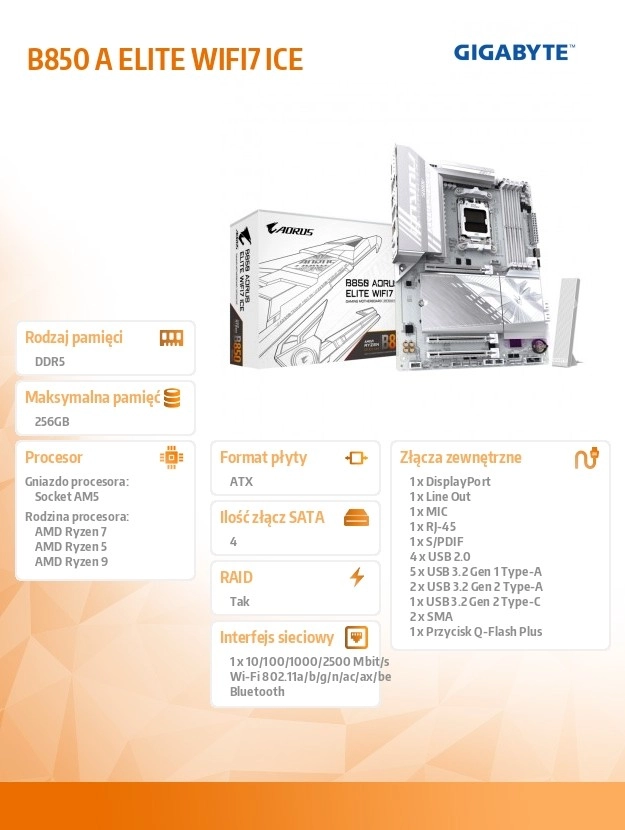 Zmogočna osnovna plošča GIGABYTE za platformo AMD AM5 je pripravljena na najnovejše procesorje Ryzen 9000/8000/7000 in ponuja vrhunsko igralno opremo: DDR5 do 8200 MT/s, PCIe 5.0, 3× M.2, robusten 14+2+2‑fazni VRM ter izjemno hitro povezljivost Wi‑Fi 7 + 2.5GbE LAN. Zahvaljujoč funkcijam, kot so X3D Turbo, EZ‑Latch in napredno hlajenje, je idealna izbira za stabilno zmogljivost in enostavno sestavo modernega igralnega PC‑ja.