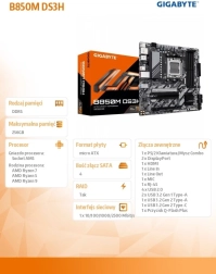 Osnovna plošča GIGABYTE B850M DS3H za podnožje AMD AM5 prinaša enostavno zvišanje igralne zmogljivosti z načinom X3D Turbo na en klik, podporo za procesorje Ryzen 9000/8000/7000, dvo-kanalni DDR5, izjemno hitro shrambo z M.2 PCIe 5.0 in omrežje 2.5 GbE – vse to v praktični zasnovi s pametnimi zapirali EZ-Latch za namestitev brez vijakov.