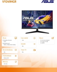 ASUS VY249HGR je vsestranski 23,8" IPS monitor, idealen za igranje, multimedijo in vsakodnevno delo. Zahvaljujoč Full HD ločljivosti in širokim vidnim kotom IPS ponuja ostro sliko in natančne barve. 120 Hz osveževanje v kombinaciji z 1 ms MPRT zmanjšuje zameglitev gibanja, zato so hitri prizori čisti in tekoči.