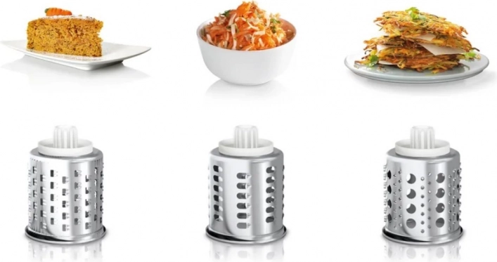 Praktični bobni za rezanje in ribanje, vključno z bobnom za krompirjeve palačinke, ter nastavek za polnjenje klobas razširijo možnosti priprave od solat do domačih specialitet.