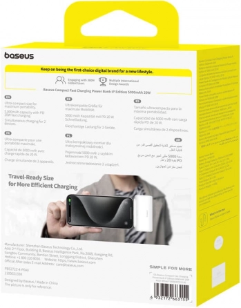 Uživajte v zanesljivem viru energije kadar koli in kjer koli. BASEUS Compact 5000 mAh z močjo 20 W hitro napolni sodobne pametne telefone in dodatke. Zahvaljujoč vgrajenemu USB‑C priključku jo lahko priklopite neposredno na telefon brez kabla ali uporabite priložen kabel USB‑C–USB‑C.