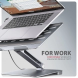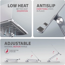 - Lahka in toga kovinska konstrukcija; nedrseče površine; več položajev; višina do 205 mm; nastavitev naklona baze 180°–90° in roke 180°–90°; boljše odvajanje toplote; enostavno zložljivo