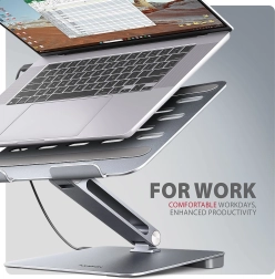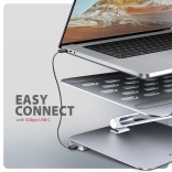 Elegantna in trpežna konstrukcija iz aluminijeve zlitine nudi pasivno hlajenje in stabilnost, medtem ko nedrseče površine ščitijo napravo pred praskami. Stojalo z dvojnim zgibom omogoča natančno nastavitev višine do 205 mm in naklona, da je zaslon v isti ravnini z zunanjim monitorjem. Hub razširi vaš prenosnik z HDMI 4K/60 Hz, 3x USB-A 5Gbps, RJ‑45 Gigabit in USB‑C PD vhodom 100 W.