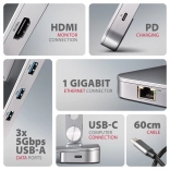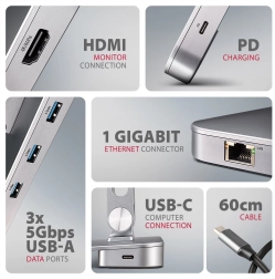 Izhod HDMI podpira do 4K/60 Hz, 2K/120 Hz in 1080p/200 Hz vključno s HDR in večkanalnim zvokom. USB-A 5Gbps upravlja zunanje diske (do dva hkrati), periferne naprave ter polnjenje do 7,5 W. Gigabit Ethernet zagotovi stabilno omrežno povezavo, prek USB‑C PD 3.0 pa napolnite prenosnik z močjo do 100 W. Povezava je enostavna zahvaljujoč Plug & Play in Hot Plug.