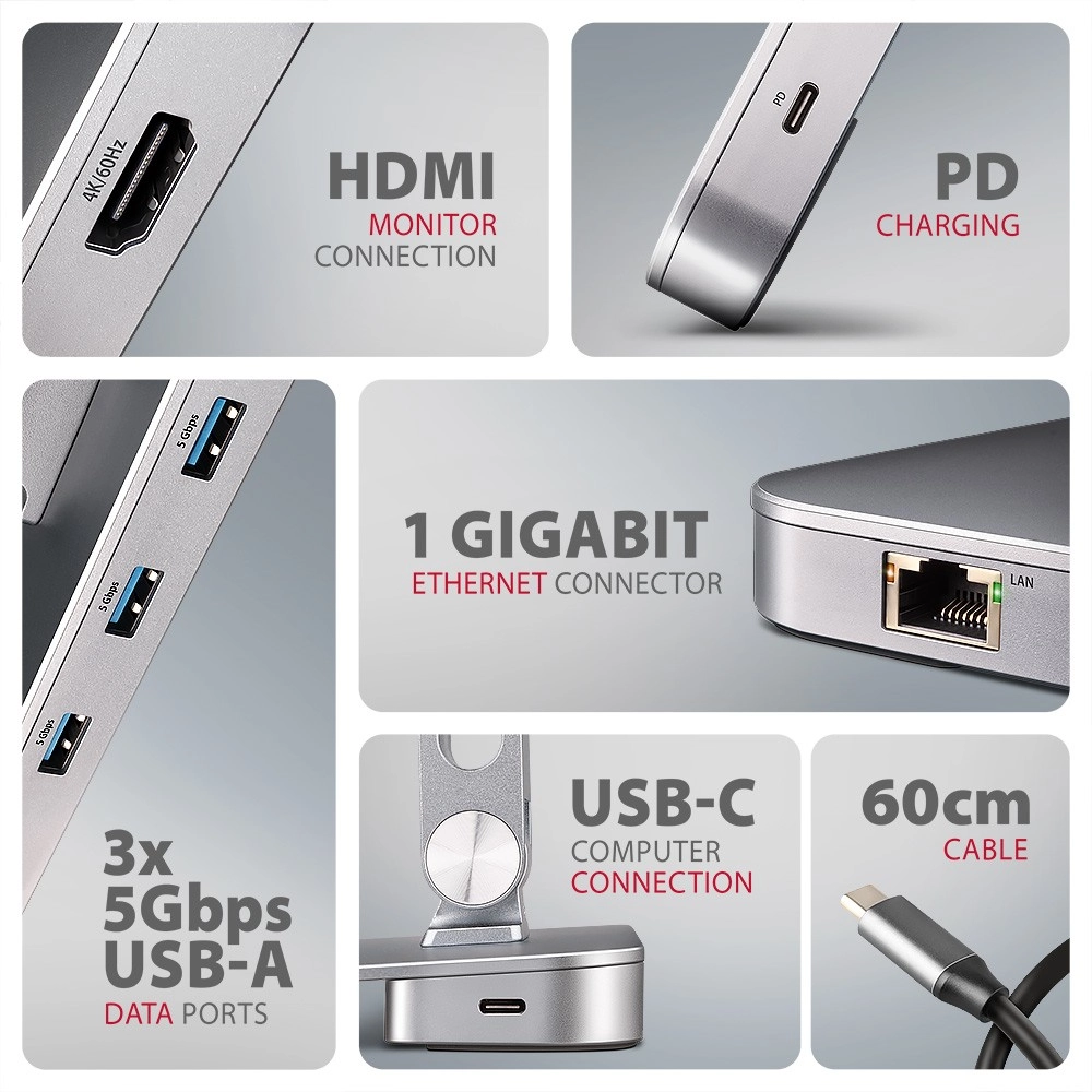 Večnamensko stojalo in razdelilnik AXAGON HMC-STND vaš prenosnik ali tablico spremeni v polnokrvno delovno postajo. Ponuja 7-v-1 vmesnike vključno z HDMI do 4K/60 Hz, 3x USB-A 5Gbps, Gigabit Ethernet in USB-C Power Delivery 100 W. Ergonomsko aluminijasto stojalo z dvojnim zgibom je primerno za naprave 10–16", izboljša hlajenje in udobje pri delu. Povezavo s prenosnikom zagotavlja 60 cm USB‑C kabel, vse deluje takoj zahvaljujoč Plug & Play.