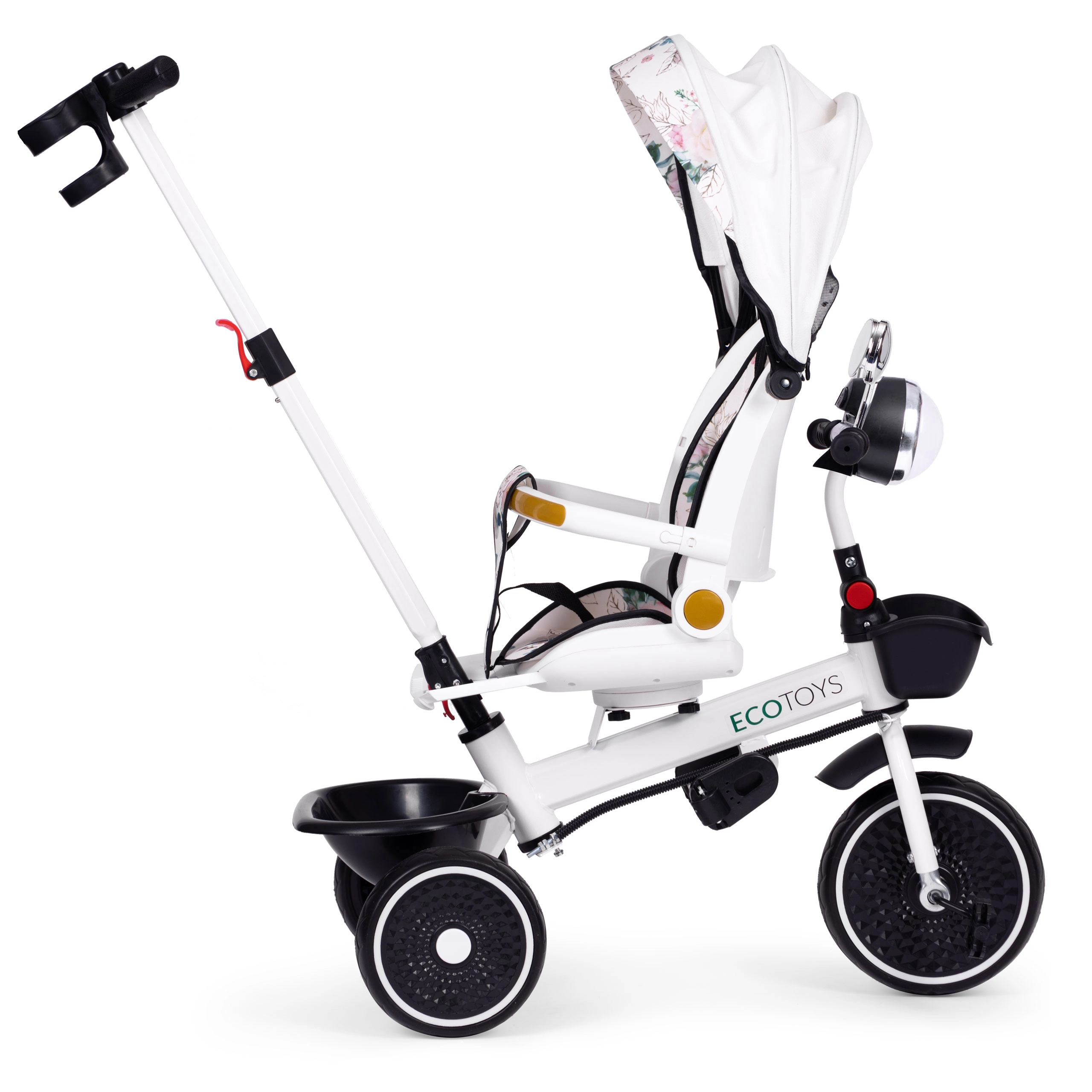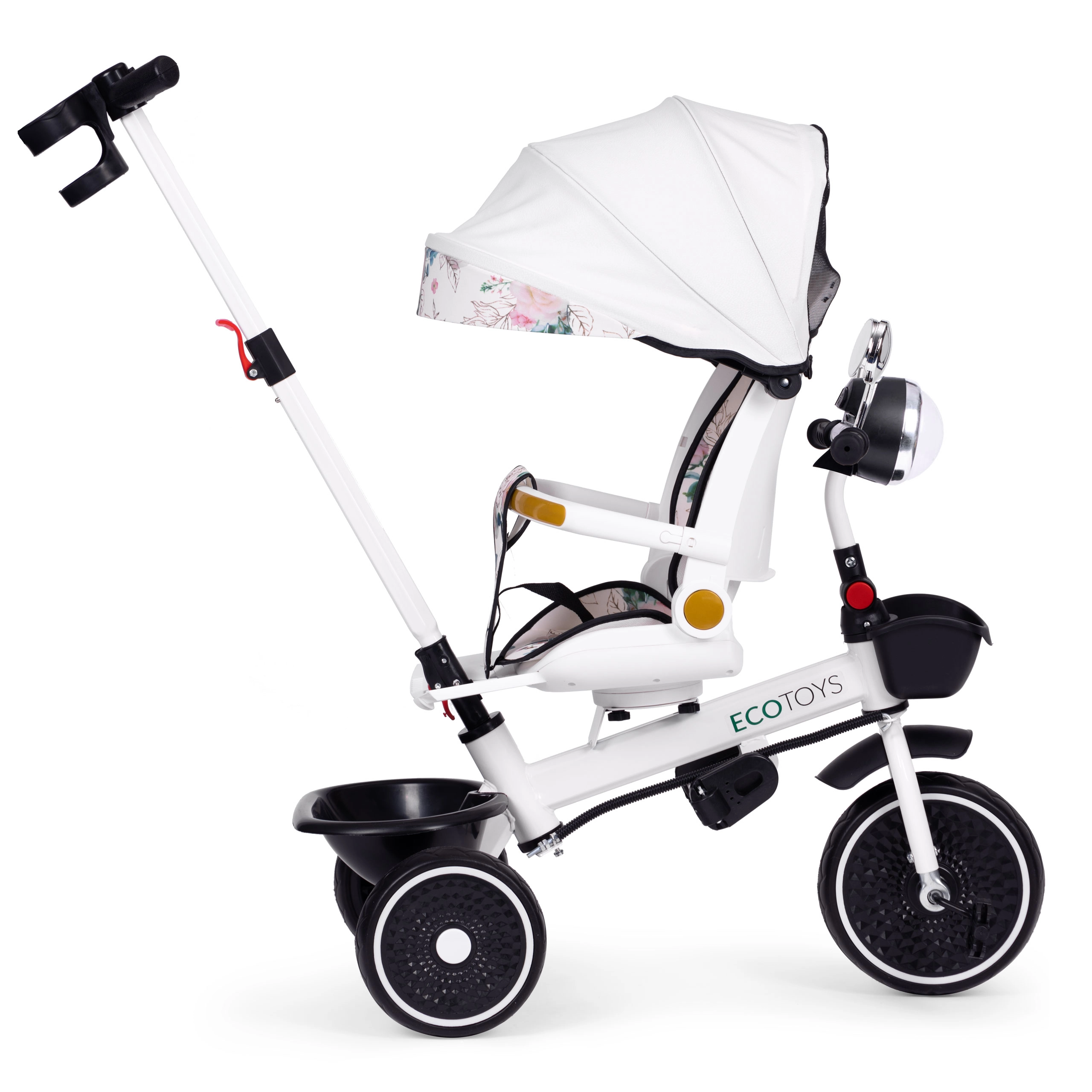 Iščete trikolesnik, ki raste z vašim otrokom? ECOTOYS prinaša premišljeno rešitev: kombinacijo vozička in trikolesnika z prilagodljivo konfiguracijo. Preprosto odstranite varovalni lok, strehico in starševski ročaj, zato se izdelek prilagodi starosti in spretnostim otroka. 360° vrtljiv sedež omogoča vožnjo mlajših otrok obrnjeno k staršu, starejšim pa naprej za boljši pogled in zabavo.