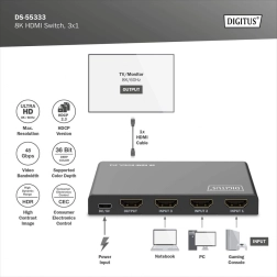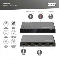 Razširite svoj televizor ali monitor z dodatnimi vhodi HDMI in preklapljajte med napravami brez menjave kablov. HDMI stikalo 3×1 znamke DIGITUS ponuja loèljivost do 8K/60 Hz (4:4:4), podporo za HDR in HDCP 2.3. Napajanje poteka udobno prek USB‑C, upravljanje pa omogoča daljinski upravljalnik ali samodejno preklapljanje na nazadnje aktiven vir.