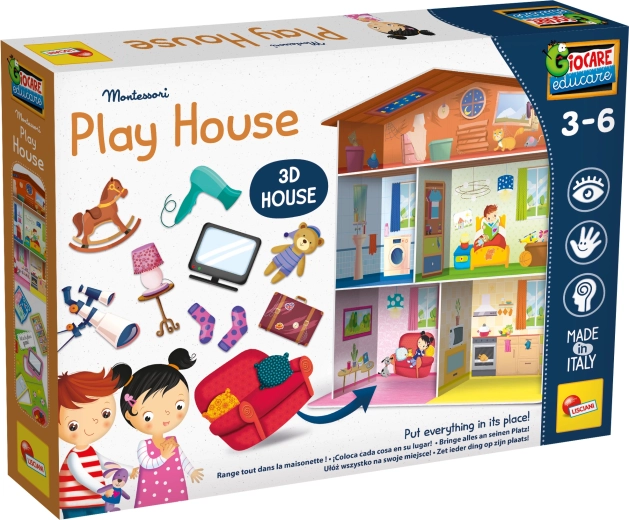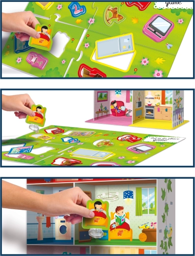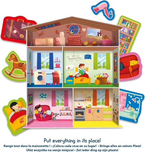 Del seta so hišica, sestavljanke v obliki domače opreme in 15 stojal za kartice, s katerimi lahko elemente pregledno razstavite ali jih uporabite za različne igralne scenarije. Odlična izbira za otroke od 3 let, ki se učijo razvrščati, poimenovati in ustvarjati lastne zgodbe.