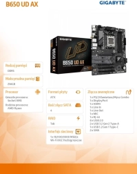 Osnovna plošča GIGABYTE B650 UD AX za podnožje AM5 prinaša stabilno napajanje, podporo za AMD Ryzen 7000/8000/9000, hitro pomnilniško tehnologijo DDR5 in bliskovito shrambo M.2 PCIe 5.0/4.0. Ponuja tudi Wi‑Fi 6, GbE LAN, sodobno povezljivost HDMI/DP in USB 10 Gb/s ter uporabne funkcije, kot so EZ‑Latch, Q‑Flash Plus in Smart Fan 6 za enostavno sestavo in zanesljivo delovanje.
