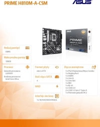 Matična plošča ASUS PRIME H810M-A-CSM je zasnovana z mislijo na potrebe sodobnih uporabnikov. Z merami 24,4 x 22,2 cm ponuja obilo možnosti za razširitve in priklop perifernih naprav. Zahvaljujoč podnožju LGA1851 zagotavlja podporo najnovejšim procesorjem Intel Core Ultra.