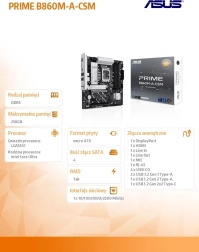 Osnovna plošča ASUS Prime B860M-A CSM prinaša zanesljivo zmogljivost za procesorje Intel Core Ultra in moderno opremo za hitre ter stabilne sestave. Zahvaljujoč čipovju Intel B860, podpori za DDR5 do 256 GB in vmesnikom PCIe 5.0/4.0 nudi odličen pretok podatkov, razširljivost in dolgo življenjsko dobo v kompaktni obliki microATX 24,4 × 24,4 cm.