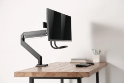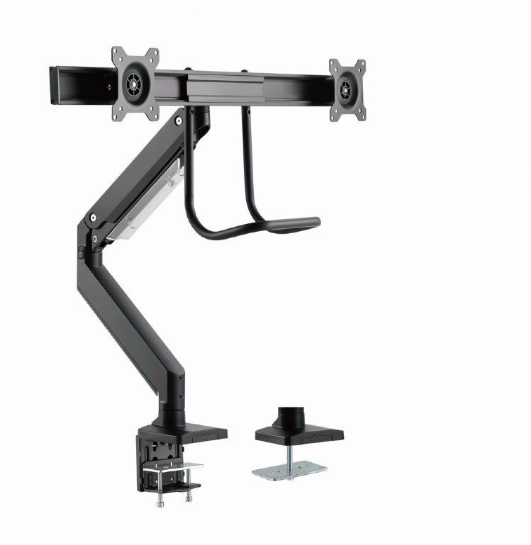 Univerzalna združljivost zagotavlja delovanje s skoraj vsakim LCD monitorjem do 32". Robustne plinske vzmeti stabilno držijo tudi težje zaslone, dve možnosti montaže (sponka na rob mize ali skozi odprtino) pa omogočata varno in hitro pritrditev.