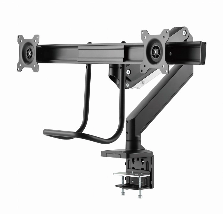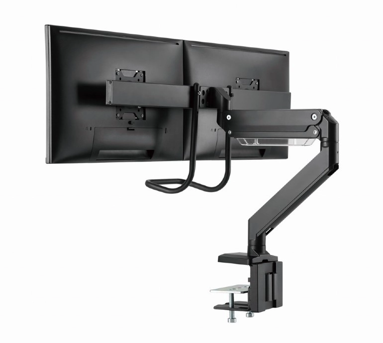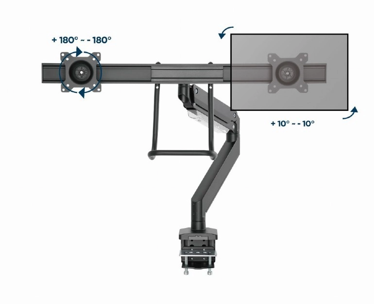 Ta dvojni nosilec za monitorje združuje eleganten dizajn in visoko nosilnost za profesionalna in domača delovna okolja. Roki se tekoče vrtita, izvlečeta, zasuneta in nagibata, tako da zlahka nastavite idealni kot gledanja in zmanjšate obremenitev vratu ter hrbta.