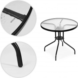 Okrogla površina s premerom 80 cm nudi dovolj prostora za štiri osebe. Posebna konstrukcija okvirja zagotavlja stabilnost in odpornost na obremenitve in uporabo senčnika.