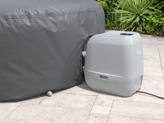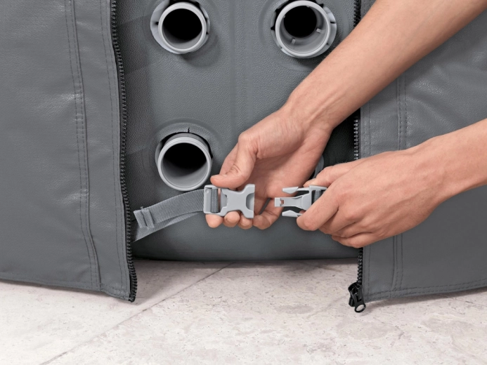 Montaža je hitra in intuitivna. Nastavljiv obodni pas z varnostnimi sponkami zagotovi čvrsto pritrditev, medtem ko integrirana zadrga omogoča brezhibno priključitev na črpalko brez potrebe po snemanju pokrova. Pokrov je združljiv z modeli Lay‑Z‑Spa St. Moritz, Monaco, Santorini HydroJet Pro in drugimi okroglimi masažnimi bazeni s premerom 216 cm.