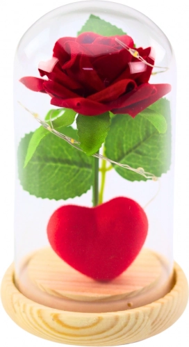 Večna rdeča vrtnica v stekleni kupoli z LED osvetlitvijo in srčkom 14 × 8 cm