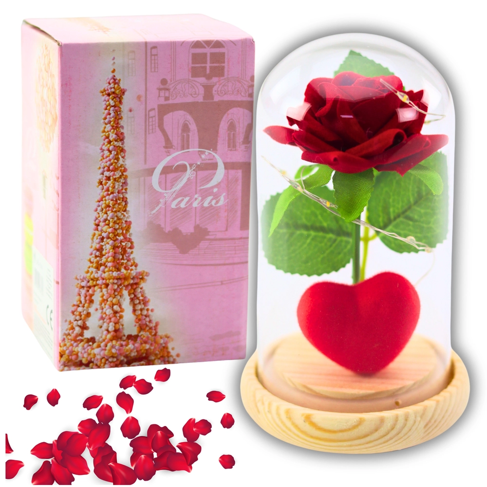 Večna rdeča vrtnica v stekleni kupoli z LED osvetlitvijo. Elegantno darilo v darilni embalaži, brez vzdrževanja, toplo belo svetlo, lesena osnova.