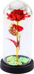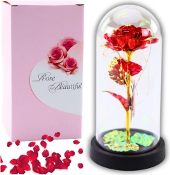 Večna vrtnica v stekleni kupoli z LED osvetlitvijo je elegantno in simbolično darilo. Simbolizira ljubezen in čustva, ki nikoli ne zbledijo. Vrtnica ohranja svojo lepoto za vedno, ne da bi zahtevala kakršno koli nego. Delikatna LED svetloba poudari lepoto vrtnice in ustvari toplo atmosfero, idealno za dekorativne namene ali romantične trenutke. Elegantna steklena kupola ščiti vrtnico in omogoča, da njen čar občudujete iz vsakega kota. Trden in stabilen plastičen podstavek zagotavlja varnost in estetskost darila.