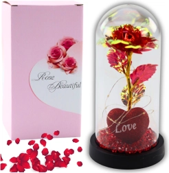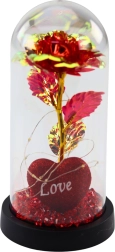 LED osvetlitev ustvarja toplo svetlobo, ki poudarja lepoto kristalne vrtnice in prostoru daje edinstveno vzdušje. Elegantna kupola ščiti vrtnico in omogoča občudovanje njenega čara z vseh strani. Plastično podnožje je močno in stabilno, kar zagotavlja varnost in estetiko darila.