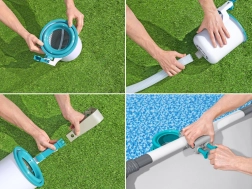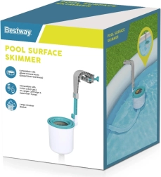 Površinski skimmer za bazen podjetja Bestway je zelo učinkovit način za odstranjevanje nečistoč iz prostostoječih bazenov. Ta površinski filter se preprosto pritrdi na notranjo steno bazena v bližini sesalnega vhoda. Priključite ga na filtrirno črpalko (primeren za črpalke s pretokom nad 2.006 litrov/uro) in opazujte, kako samodejno začne zbirati nečistoče. Ko je košek poln, ga lahko enostavno izpraznite in ponovno uporabite. Nastavljiv montažni nosilec omogoča poravnavo koška glede na nivo vode.