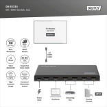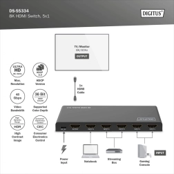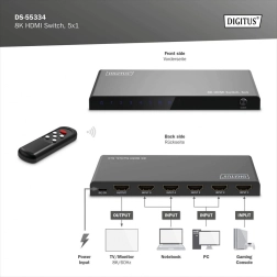 Razširite svoj televizor ali monitor z dodatnimi priključki HDMI in preklapljajte med do petimi viri z enim kablom. Stikalo DIGITUS ponuja 8K/60 Hz (4:4:4), HDMI 2.1, HDR in HDCP 2.3. Upravljanje je enostavno zahvaljujoč daljinskemu upravljalniku in samodejnemu preklapljanju, napajanje zagotavlja USB‑C, trpežno kovinsko ohišje pa se poda vsaki postavitvi.